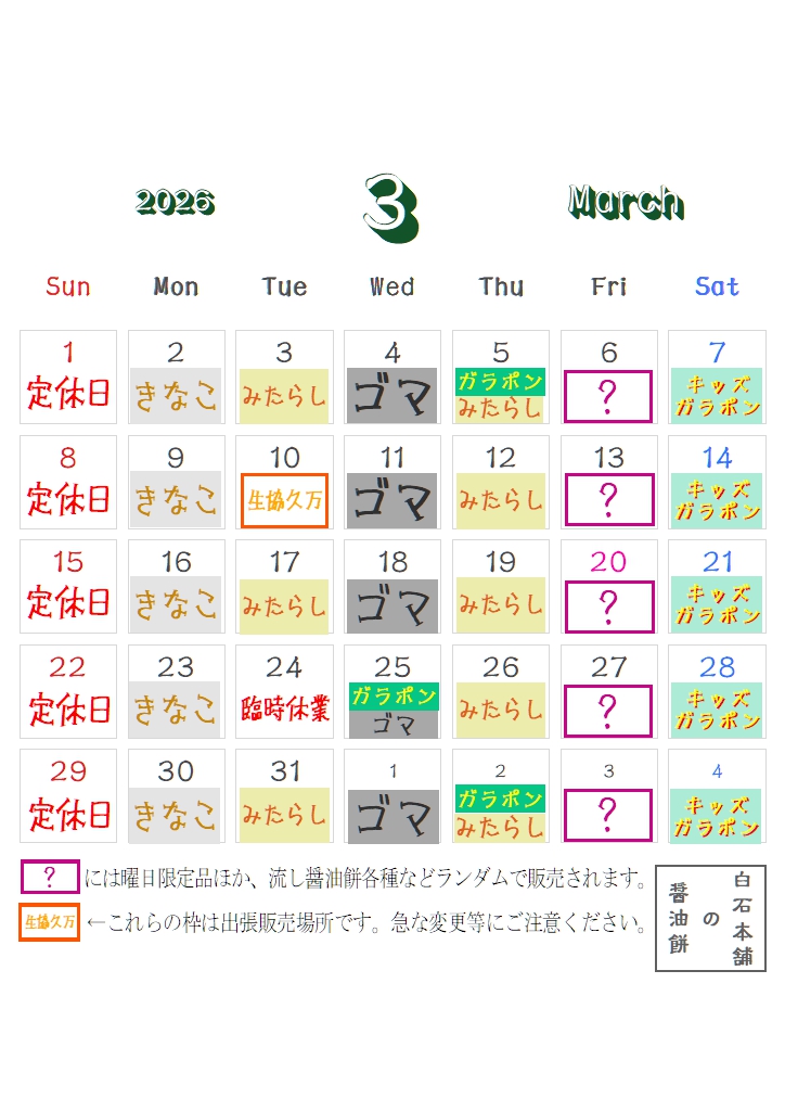 3月の営業カレンダーです。 ※翌月4月2日の「ガラポン」は間違いです。ご理解ください。