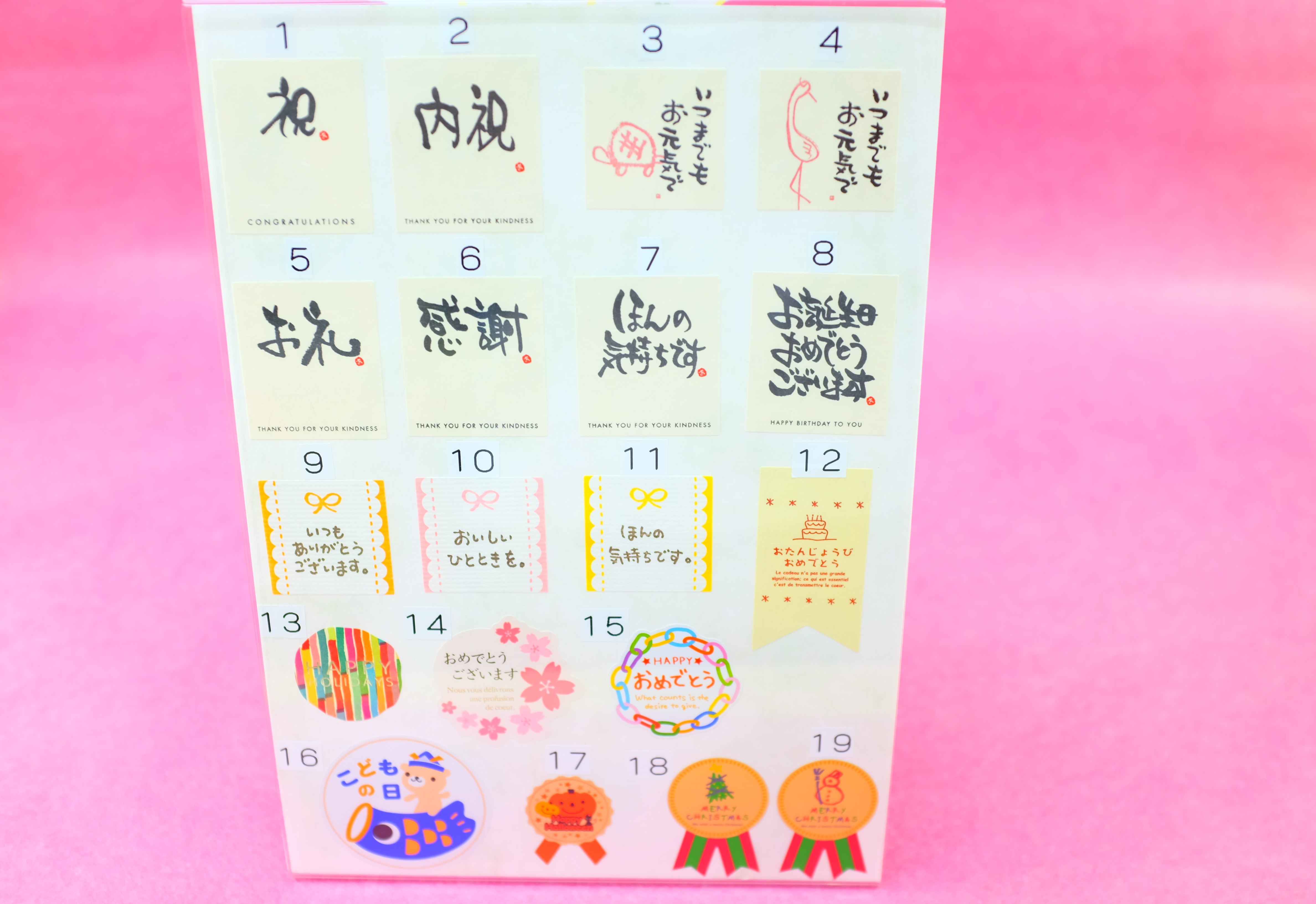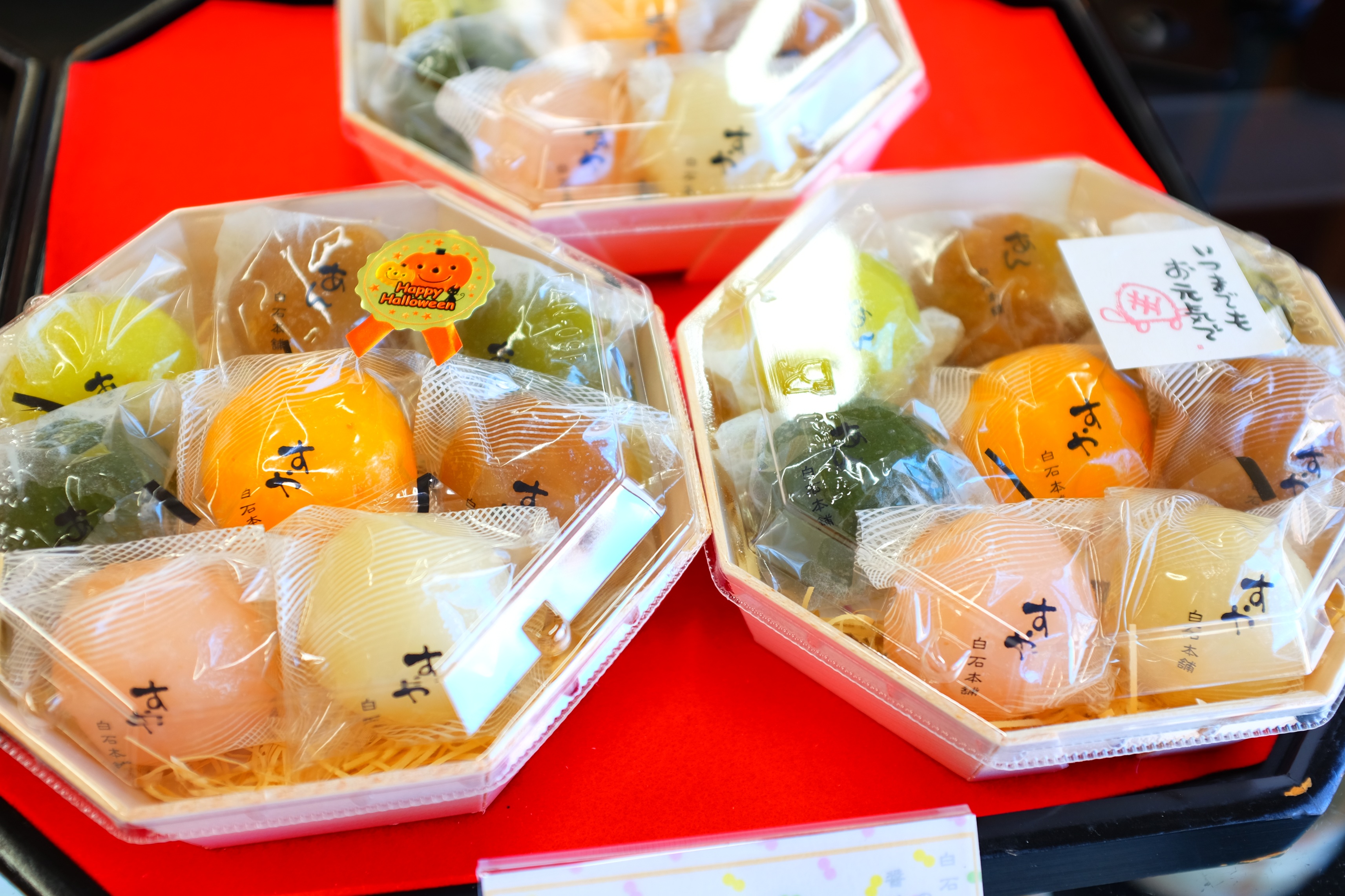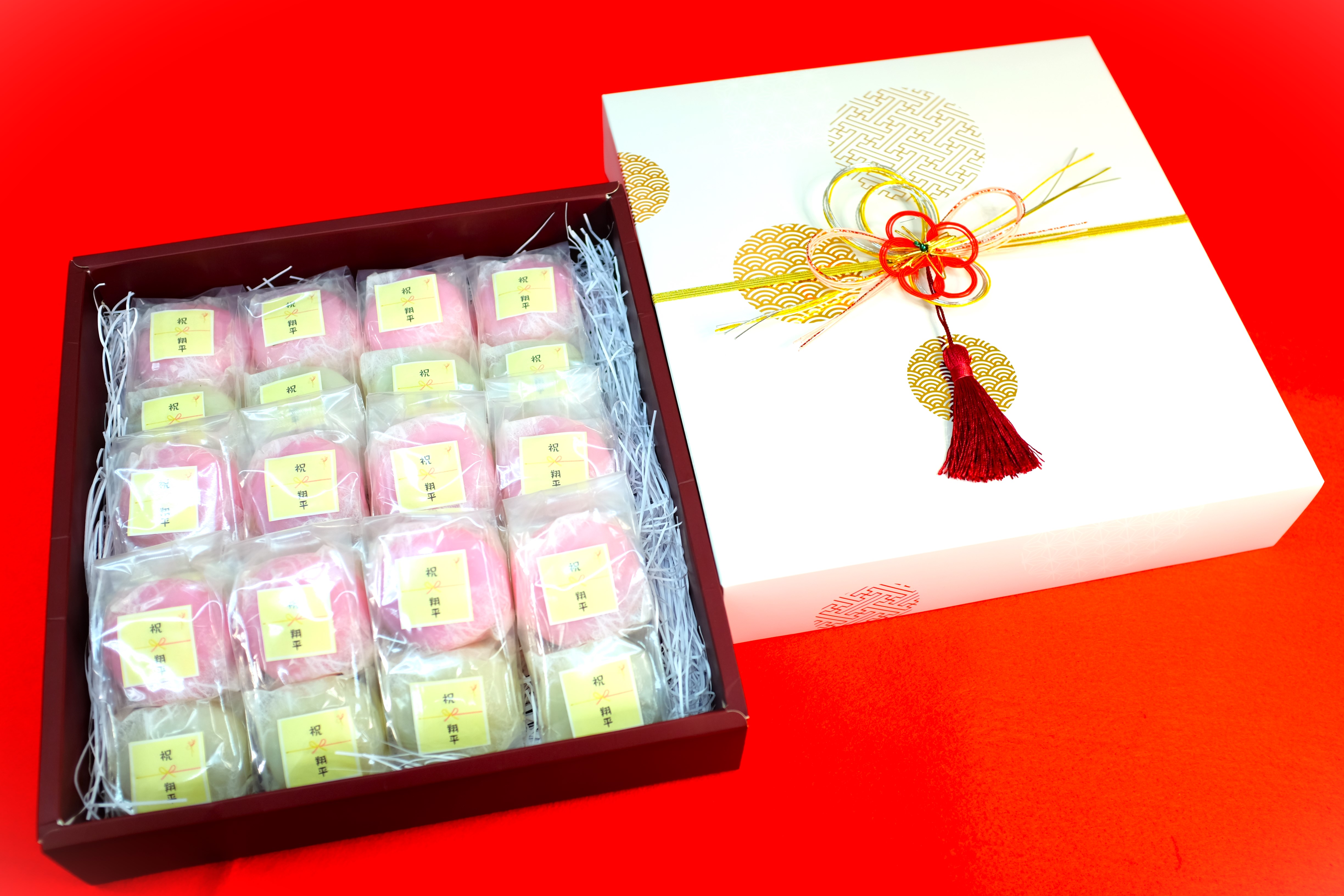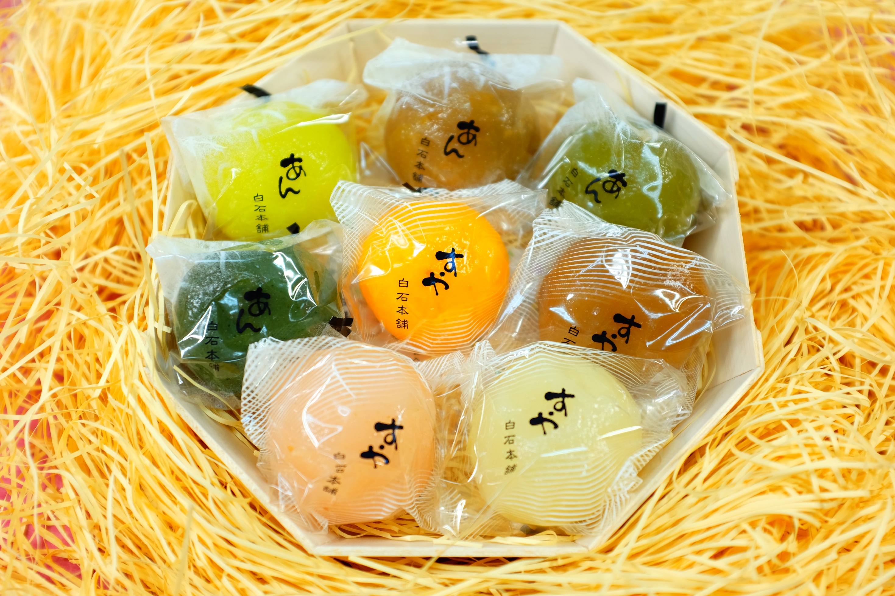 米粉(国内製造)、餅粉、砂糖、小豆、醤油(大豆・小麦を含む)、抹茶、梅肉、柚子、伊予柑、よもぎ、きな粉、水あめ、ホワイトチョコ(乳含む)、チョコシロップ、片栗粉、餅米、カシューナッツ、金箔/着色料(赤3・黄4)